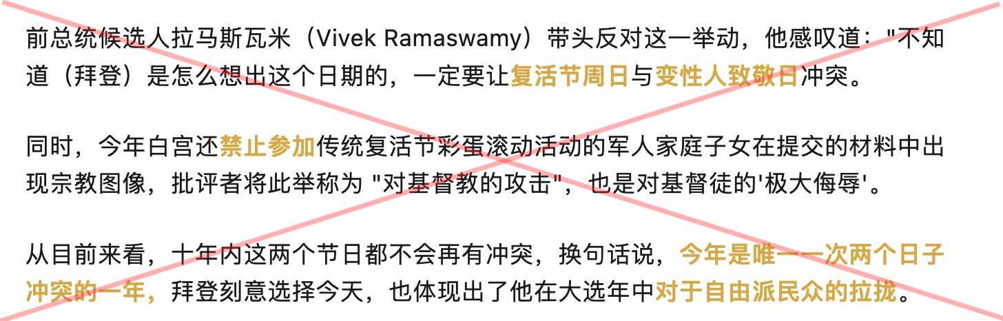 还有一些虚假的愤怒,指称拜登禁止在白宫的复活节彩蛋设计大赛中使用任何宗教符号——但这明明是45年来的传统。