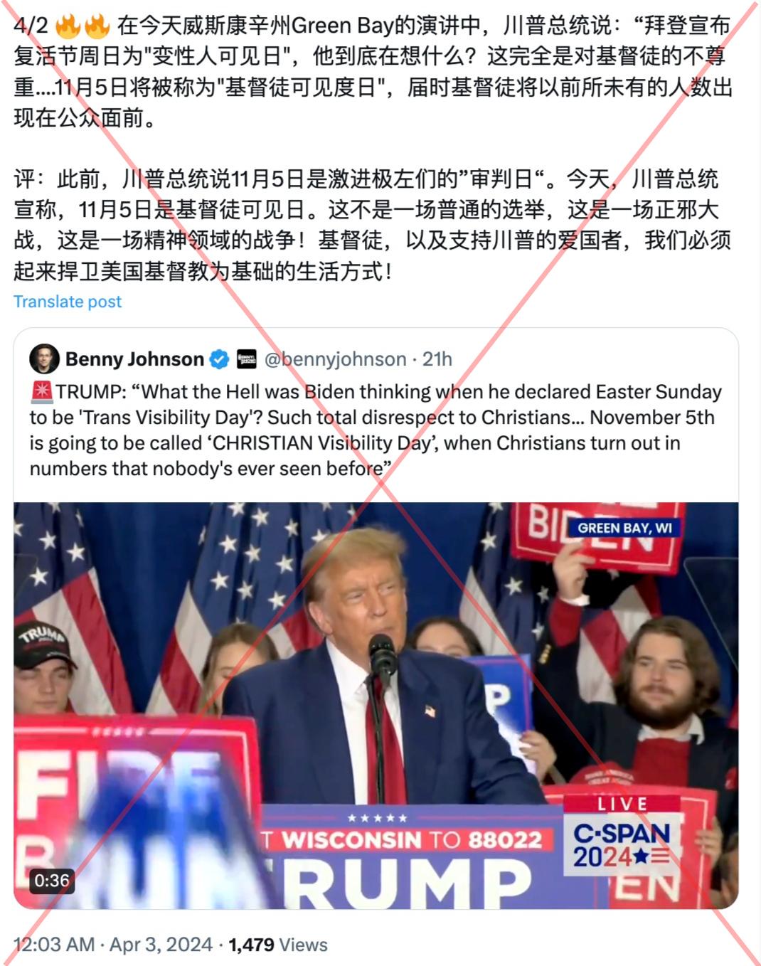 川普也没有错过这个机会,刚刚推销了60美元圣经的他在4月2日威斯康辛的演讲中表示:“当拜登宣布复活节周日为‘跨性别能见日’时,他到底在想什么?这完全是对基督徒的不尊重……11月5日将被称为‘基督徒可见日’,在这一天,基督徒会以前所未有的数量出现。”