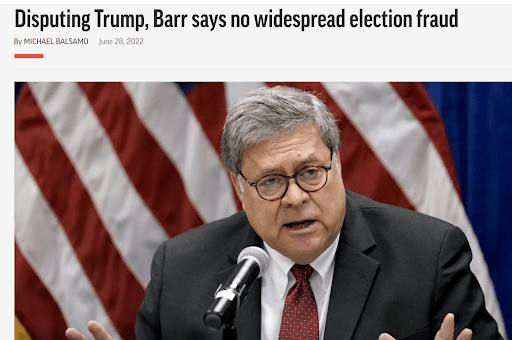 司法部长巴尔六月曾表示,美国司法部没有发现任何可能改变2020年大选结果的广泛的选民欺诈证据,他对总统川普持续不断、毫无根据的说法提出异议。