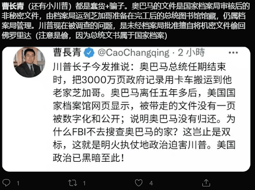 右翼将FBI调查川普擅自带走机密文件与奥巴马带走非机密文件混为一谈。图源:推特截图