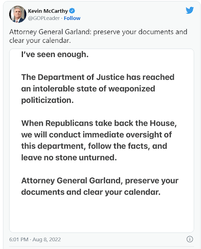 “司法部长梅里克·加兰(Merrick Garland):请保留你的文件,清理你的日历。我已经看够了。”,麦卡锡写道:“司法部已经达到了一个不可容忍的武器化政治化状态。当共和党人夺回众议院时,我们将立即对这个部门进行监督,遵循事实,不遗余力。”