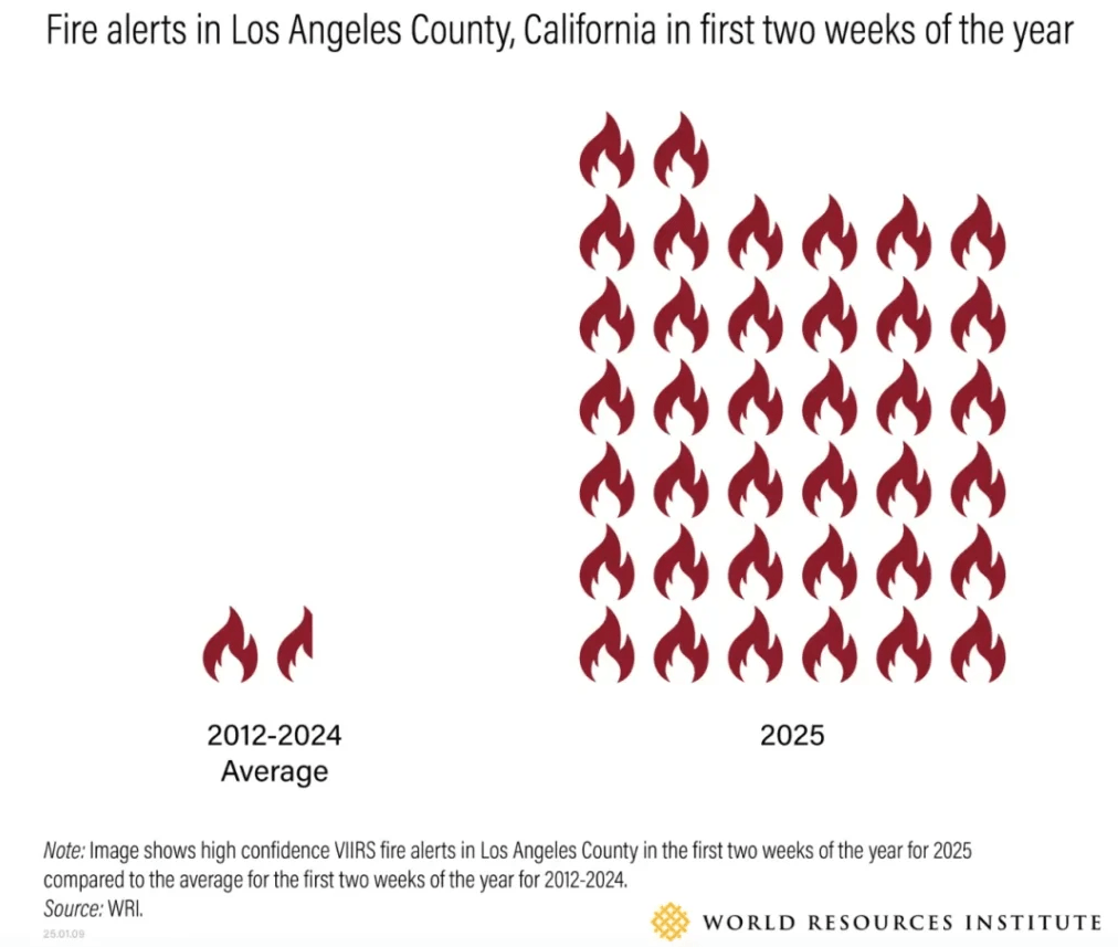 根据世界资源研究所(World Resources Institute)的数据,在大多数年份中,洛杉矶在一年的前三个月都不会检测到火灾警报,更不用说前两周了。只有在 2021 年,在 1 月至 3 月期间有超过 10 次火灾警报。那一年也成为加州野火最严重的一年。下图为洛杉矶郡在 1 月份前两周发生火警的图表,左边是 2012-2024 年的平均值,右边是 2025 年。可以看出,2025年1 月份发生火警实属异常。