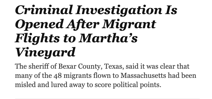 9月20日,被带到玛莎葡萄园的移民对佛州州长德桑蒂斯和其他州政府官员提起诉讼,指控他们在移民被带到哪里的问题上撒谎,从事“欺诈性和歧视性的计划”。