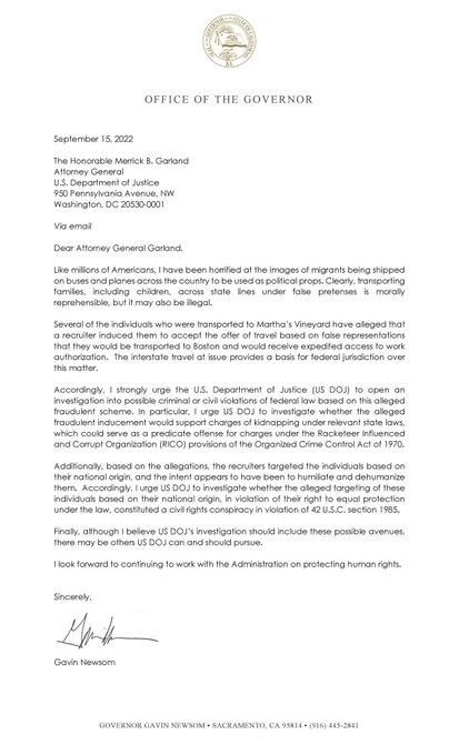 与此同时,对于德桑蒂斯用了1200万美元,阿博特用了1400万美元纳税人的运送移民。加州州长纽森,对德州和佛州州长发起了司法挑战。9月15日,纽森致信司法部长嘉兰, 要求对德桑蒂斯和阿博特用移民作为政治筹码展开刑事调查。