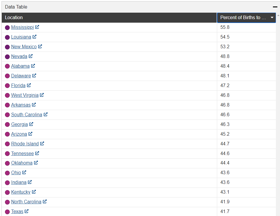出生自未婚妈妈的比例,南部的像密西西比,阿拉巴马这样的保守州是远高于加州这样偏自由派的州的。德克萨斯州也是高于加州的。
