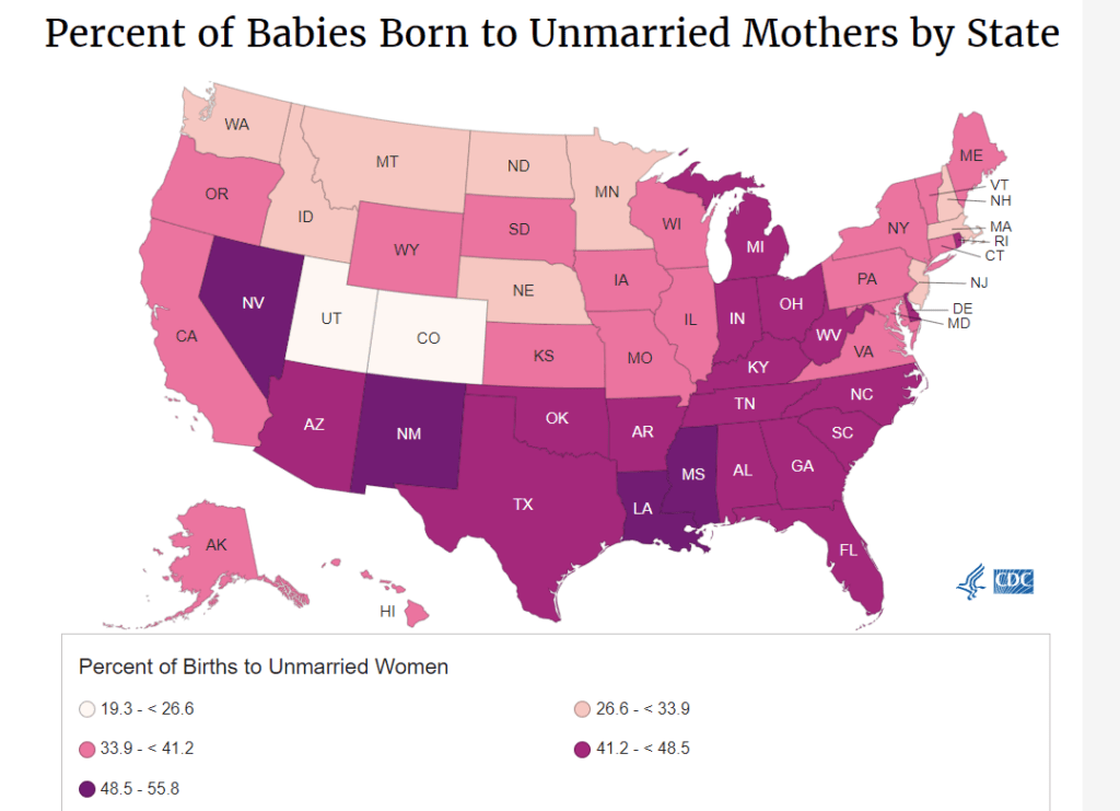 出生自未婚妈妈单亲家庭的比例,佛州是47.2%,德州是41.7%,田纳西是44.6%,阿拉巴马是48.4%,加州是38.6%。