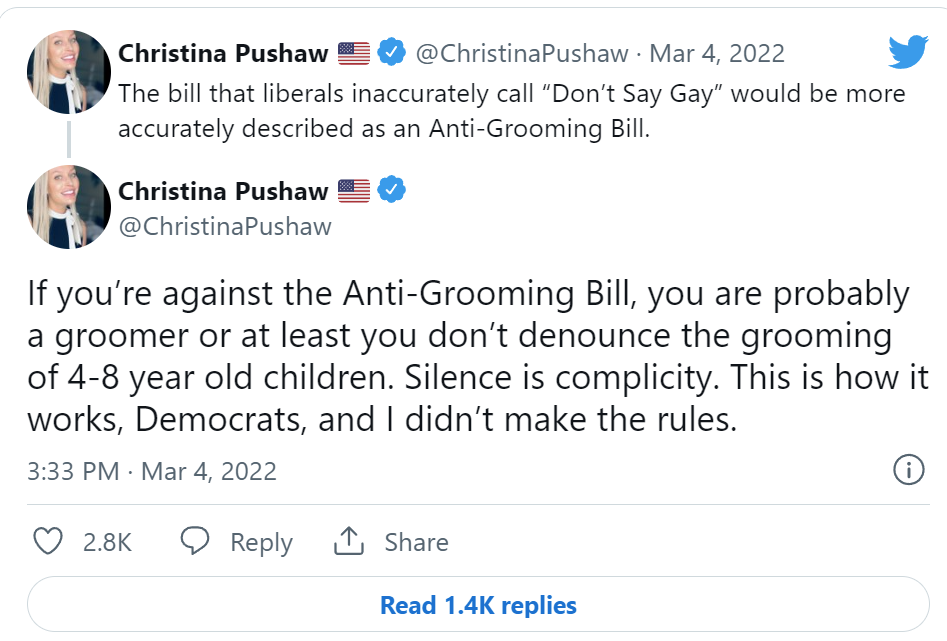 在提到该法案时,德桑蒂斯的发言人克里斯蒂娜·普肖在推特上说:”如果你反对反疏导法案,你可能是一个诱导者,或者至少你不谴责对4–8岁儿童的诱导。”这种语言符合共和党指责对手支持恋童癖的叙事。