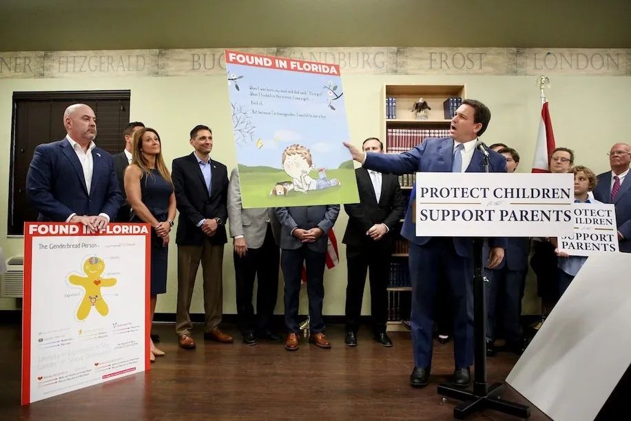 3月28日,共和党籍的佛罗里达州长,2024年有望竞选总统的罗恩·德桑蒂斯(Ron DeSantis),和其他的发言者一起站在一个贴有“保护儿童/支持父母”标语牌的讲台上,宣布签署了《家长教育权利法案》(Parental righs in education law),批评者称其为 “别说同性恋法”(Don't say gay law)。