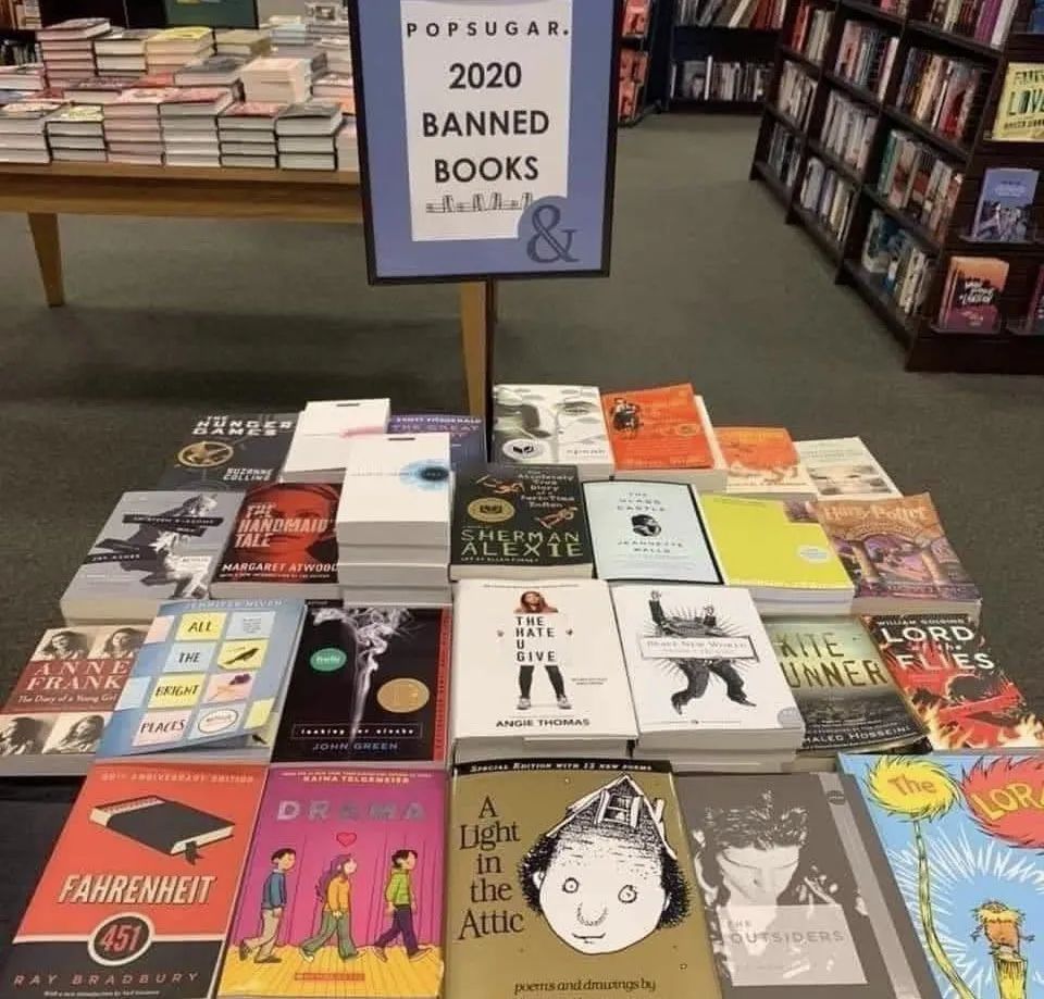 有书店把这些被禁的书摆在一起销售,可以看到都是经典名著。比如反乌托邦的书,或者是奇幻类的书,像《哈利波特》,《1984》,《动物庄园》,《使女的故事》,《饥饿游戏》,《蝇王》这些书都成了禁书。