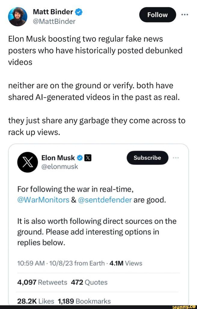 在与战争有关的虚假信息激增之际,马斯克本人也亲自推荐用户关注那些因宣传虚假信息而臭名昭著的账号。10月8日他告诉自己的1.5亿粉丝,可以通过账号@WarMonitors 和 @sentdefender实时获取战争的最新消息。