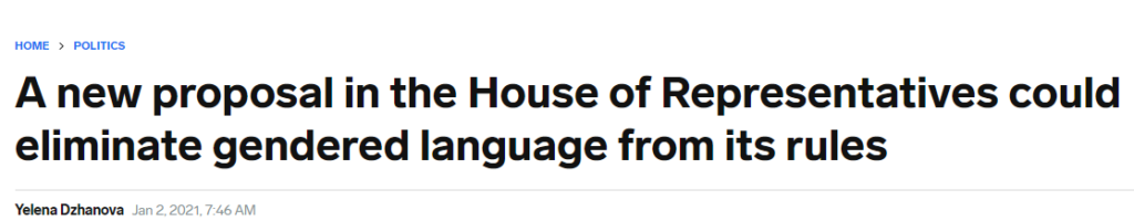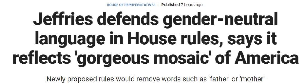 因此,众议院民主党党团主席、来自纽约州的众议员哈基姆·杰弗里斯为该党在第117届国会提出的众议院新规则辩护,特别是使用更为通用的称谓取代区分性别指称的新语言。