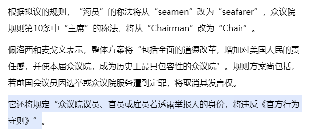 然而,美国的那些事儿这篇公号文章却故意误导说“众议员,官员和雇员透露举报人身份,将违反《官方行为守则》”。但原文中的该条款说的是对举报人whistleblower的保护,跟使用中性称呼没有任何关系,更谈不上对不使用中性称谓处罚。罗文把这个单独放在这里,给人的印象就是,如果不使用中性语言,就会被处罚一样。