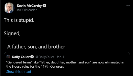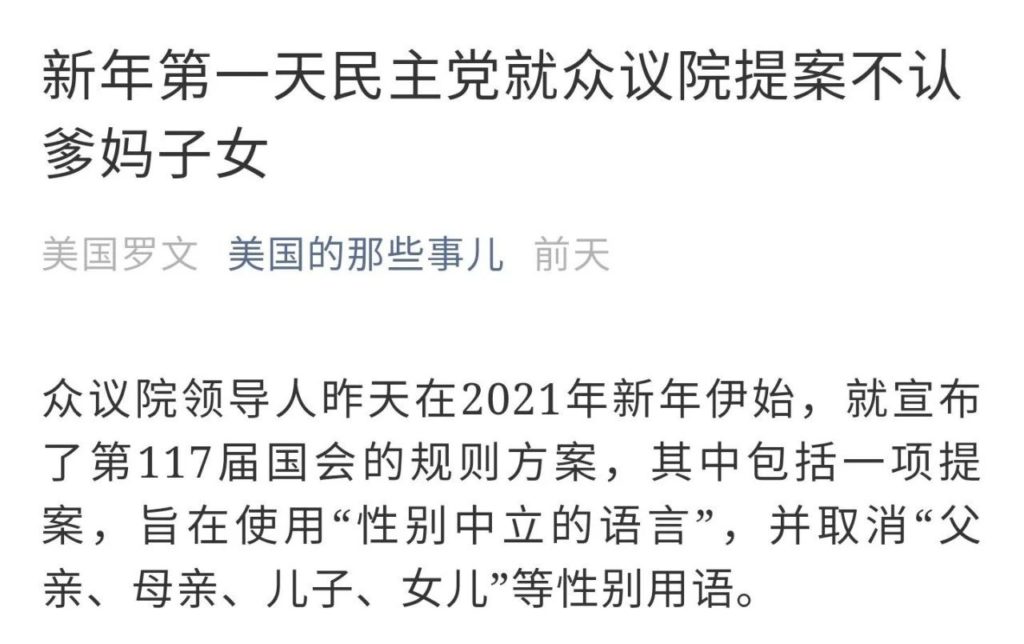 新任众议员才刚刚宣誓就职,各路谣棍也没闲着,马上就开始了新一轮的造谣。他们说民主党控制的众议院修改了议事规则,不再说父母,兄弟姐妹,而改为中性的称谓例如双亲(parent),孩子(child),手足(sibling)等。不少人看到这条消息的第一反应就是,民主党倒行逆施,必遭天谴。