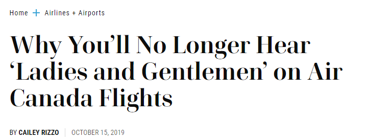 2019年10月,为了更加包容性别,加拿大航空改变了他们的问候语,欢迎“所有人”而不是“女士们先生们”。该航空公司表示,此举是为了确保所有乘客和员工都受到尊重。“女士们,先生们”的问候时刻提醒我们在日常生活中被提到性别的频率。我们在学校中被称为男孩和女孩,在父母(我们称为父母)中被称为儿子和女儿,我们的称谓都有性别(先生,小姐,夫人和女士),更不用说在官方文件中要求无数次的确认性别。