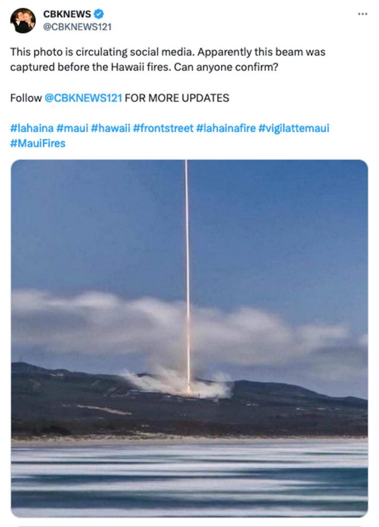 8月10日的一篇Facebook帖子显示了一束光连接地面和天空,周围是滚滚浓烟,前面是一片水域。这条帖子在一天内被转发了40多次。到了8月10日,同样的图片发在了Rumble上,又在Facebook上被转发了400多次。然后它进军X平台,声称“这束光显然是在夏威夷大火前捕获的,有人能证实吗?”这个帖子浏览量超过90万次。