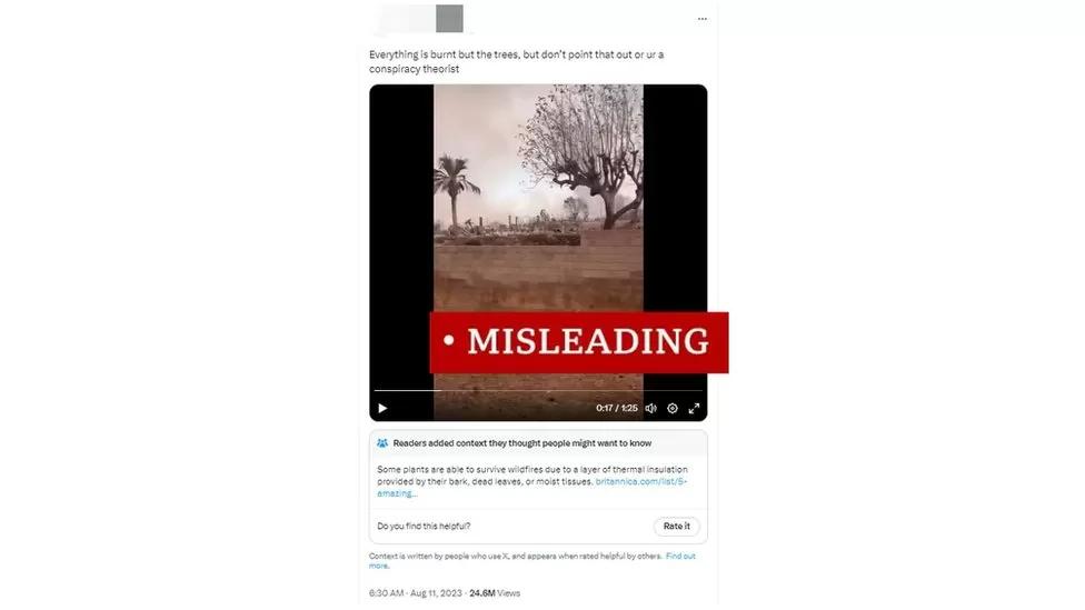 在X平台上,有一个帖子包含了一段视频,上面写着:“除了树,一切都被烧毁了,但不要指出这一点,否则你就是阴谋论者。”这条推文的浏览量已超过2400万次。