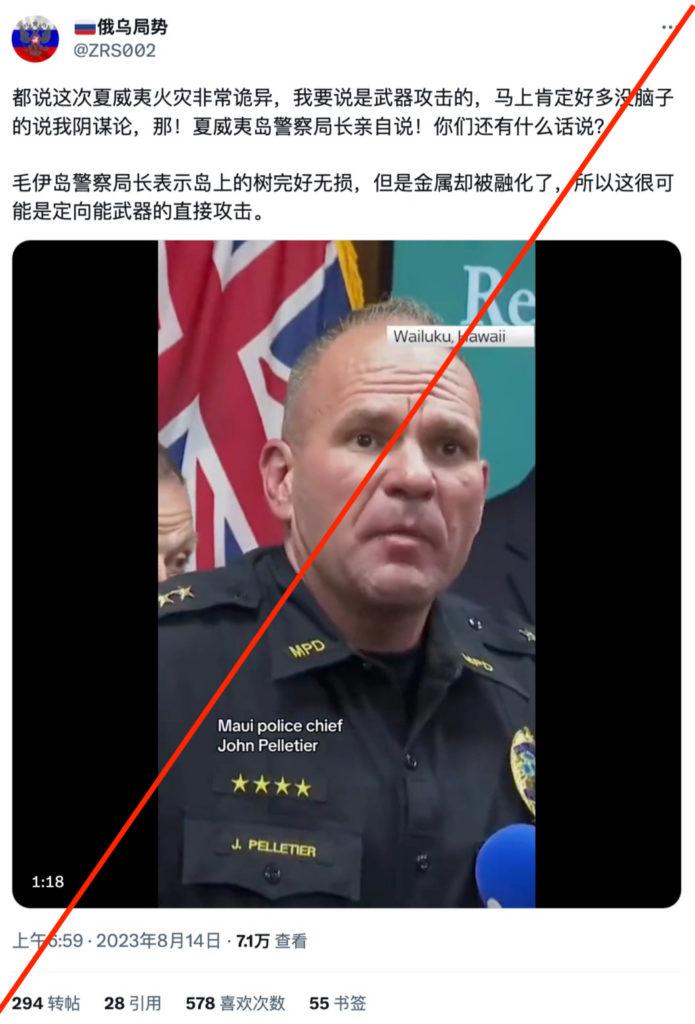 自媒体中出现的人确实是毛伊岛警察局长约翰·佩列蒂埃(John Pelletier),只不过,在视频中他完全没有提到“树”,也没有提到武器。佩列蒂埃在8月14日的新闻发布会上语气非常沉痛,他恳请人们提交DNA样本以帮助识别遇难者,要求人们能在这个过程中给予耐心,因为“我们是在一场足以熔化金属的大火中寻找遗体”。而这竟然可以被自媒体“意译”、扭曲、加工成完全不同的内容。