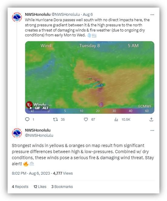 美国国家气象局公共事务主任苏珊·布坎南(Susan Buchanan)告诉法新社,该机构提前一周向当地官员发出了“夏威夷群岛危险的火灾天气状况”的警告,并在火灾开始前几天发布了官方警告。