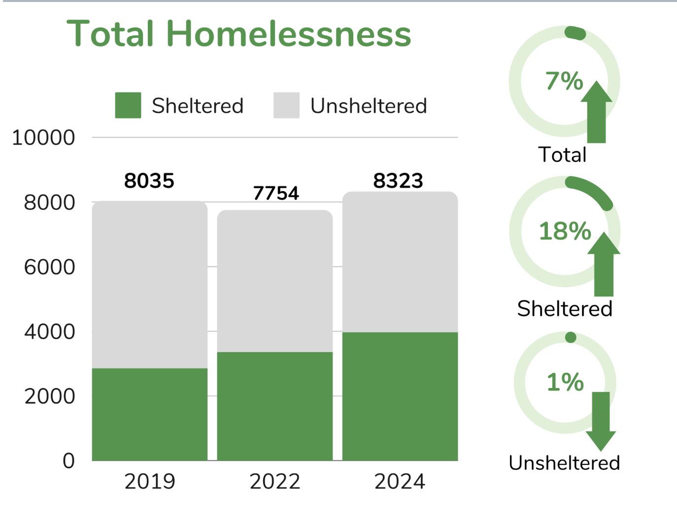 在旧金山市无家可归者和住房支持部(The Department of Homelessness and Supportive Housing, HSH)网站发布的整体数据中很容易看到,相比于2022年,2024年调查中,无家可归者的总人数达到8323人,比2022年的7754人增长了7%。