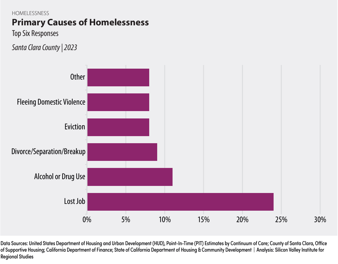一份关于同样位于湾区的圣克拉拉县的报告发现,该县去年新陷入无家可归境地的人数激增了 24%,尽管该县在过去一年内安置进庇护所的人数比以往任何时候都多。圣克拉拉县的调查显示,失业、家庭破裂、酒精和药物滥用是造成无家可归的前三个主要原因。