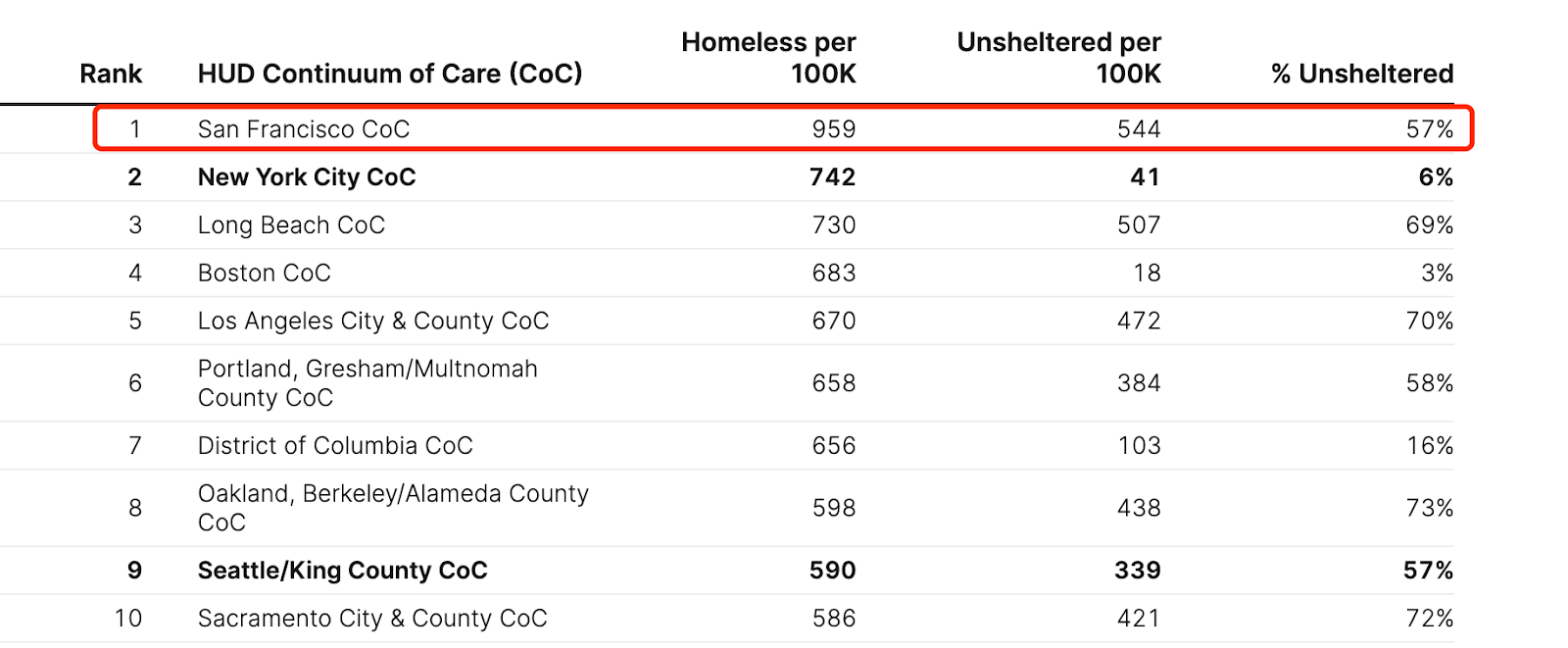 如果进行横向对比的话,旧金山的无家可归者情况在全国范围内又处于怎样的位置呢?在一份布鲁金斯研究院发布的报告中能看到,在全美主要大城市中,每10万人中无家可归者的人数旧金山排在第一位,问题确实严重。