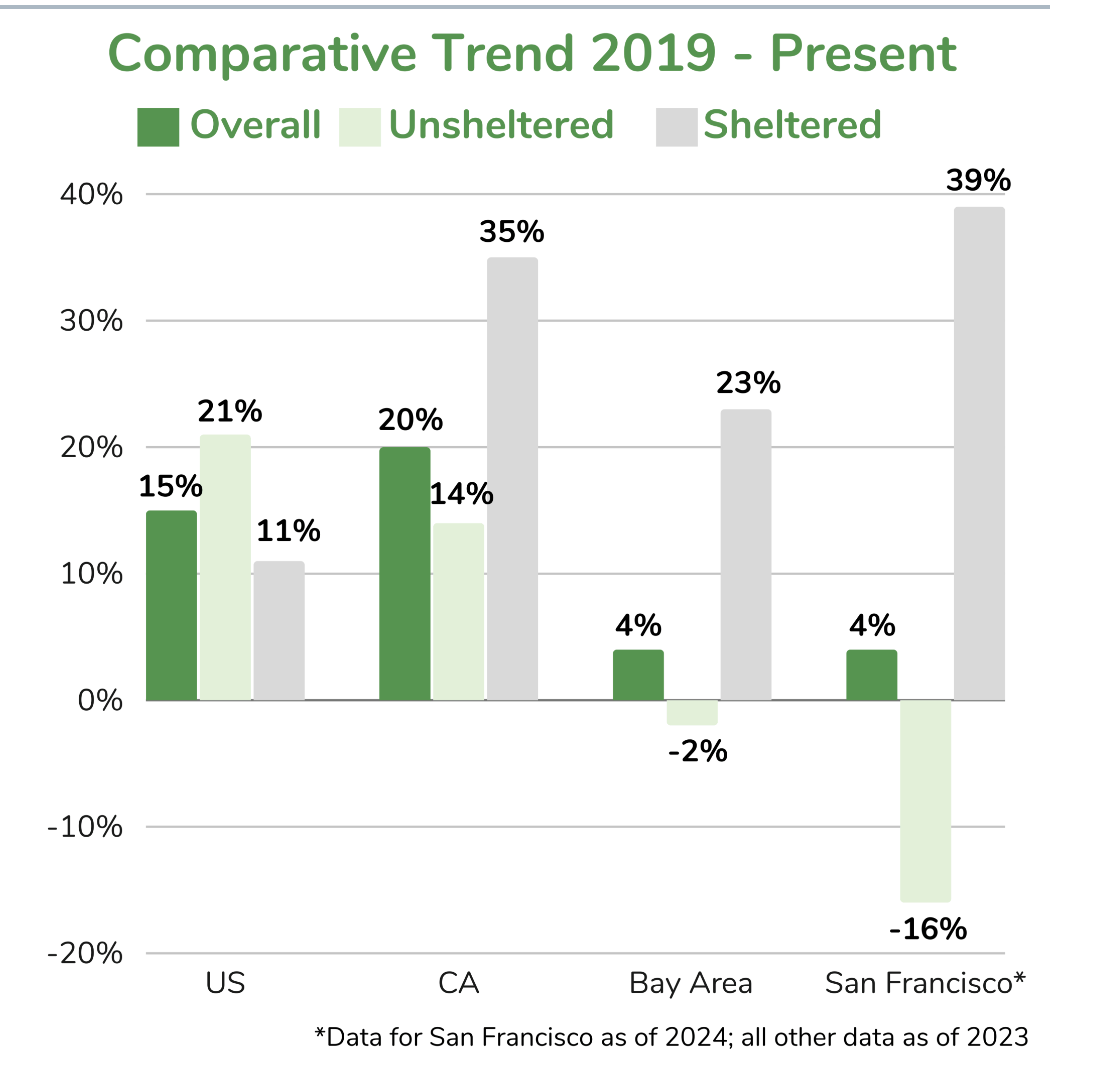 但仔细观察以上数据可以发现,旧金山无家可归者的处境似乎好了一些。相比2019年,2024年在旧金山进入庇护所的无家可归者比例明显上升,从36%增长到48%。而没有进入庇护所的无家可归者,一般指住在帐篷里或露宿街头的无家可归者比例则有所下降,2024年相比2019年下降了19%。