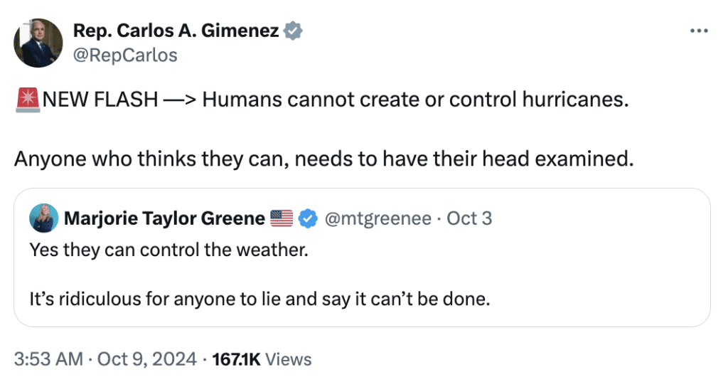 对于格林议员的疯狂言论,连她的共和党同僚都看不下去了。佛罗里达州联邦众议员、共和党人卡洛斯·吉门内斯在10月9日就评论了格林那条阴谋论推文,他说,“注意,人类无法创造或控制飓风。任何觉得人类可以这样做的人,都应该去检查一下他们的脑子。”