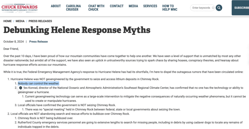 类似的,北卡罗来纳州国会众议员、共和党人查克·爱德华兹(Chuck Edwards)也在其官网上发布了一封辟谣信,对目前传播的多条虚假信息进行澄清,其中也明确提到了没有人能控制天气。
