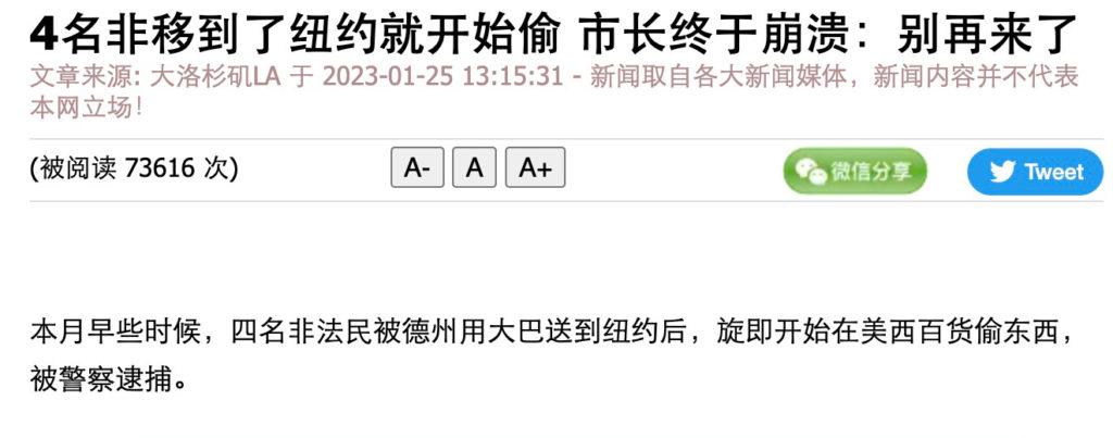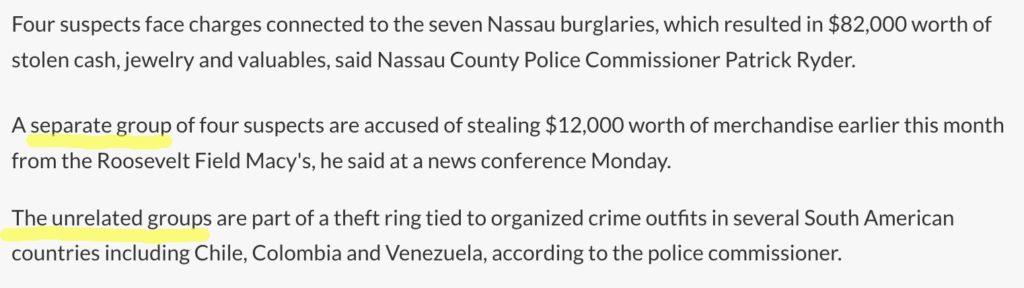 最近有中文和英文媒体称,据纽约拿骚县警察局警察透露,1月初在纽约一家百货公司实施盗窃的四人为刚刚被送到当地的“非法”移民。这些媒体还表示,这四人“实际上是南美盗窃团伙的成员”。为了进一步激发读者的愤怒,这些媒体声称,这四名嫌疑人已经被释放。评论里因此出现了大量“非法移民犯了罪可以逍遥法外”的说法。