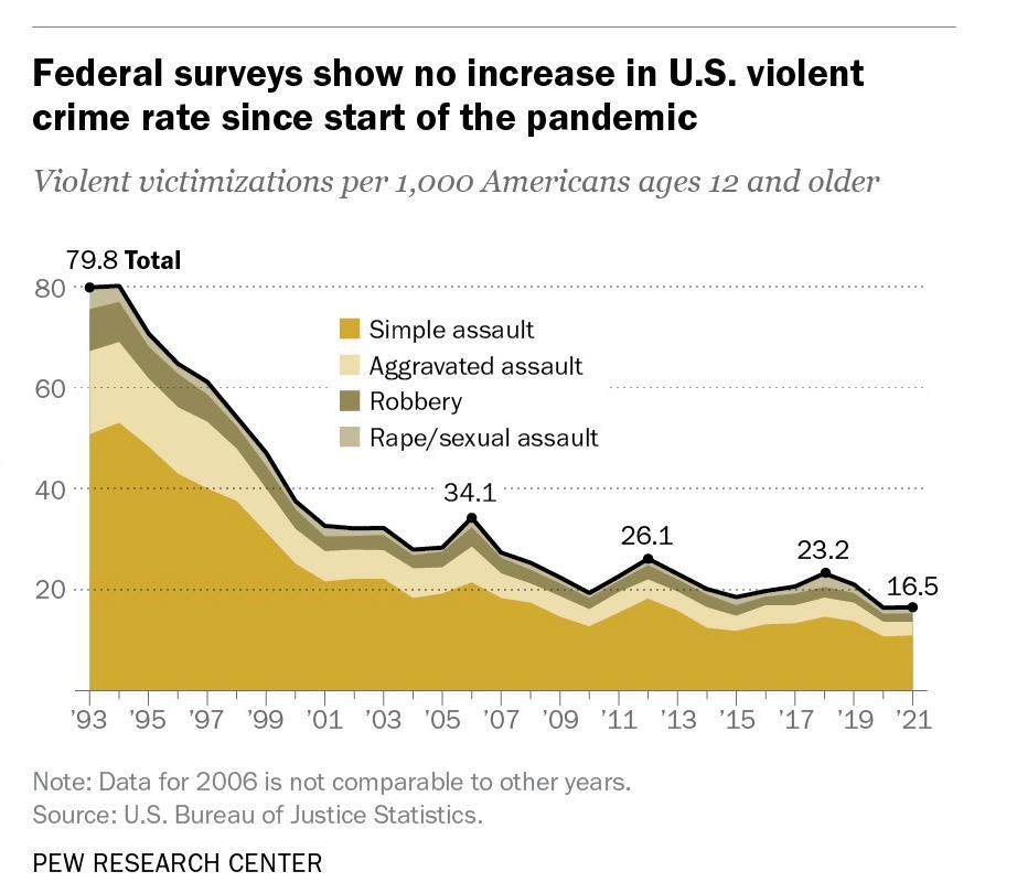 美国大约有1200万无证移民,占美国所有外国出生人口的30%。人口普查和联邦调查局数据的比较显示,从1990年到2013年,“非法”移民的数量增加了两倍,而美国的暴力犯罪率下降了近一半。事实上,美国暴力犯罪持续下降的趋势一直延续到了2021年(这是有可用数据的最近一年)。