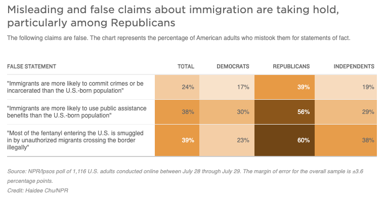 四年前,全国公共广播电台询问“移民是否比在美国出生的人口更有可能犯罪或被监禁”。当时,超过60%的受访者正确地认定这一说法是错误的。但今年再问时,只有49%的人说这是错误的。