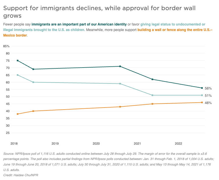 还有一种理论认为,当人们认为南部边境出现混乱时,对移民的支持往往会下降。而且,虚假信息和误导性声明的传播也可能是一个因素。