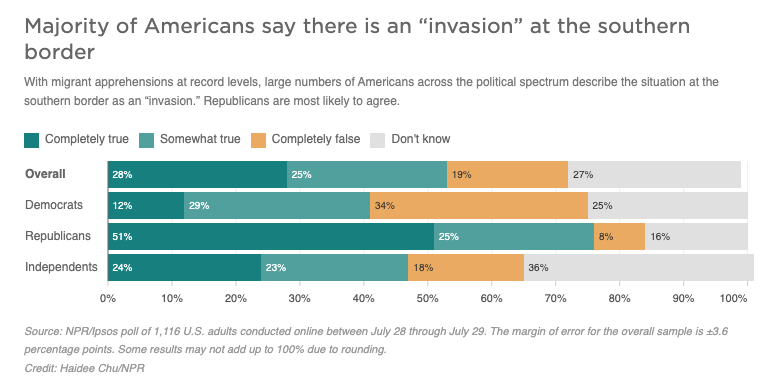 尽管如此,民意调查显示,“入侵”一词已经被广泛的美国人所接受,用来描述在南部边境发生的事情。