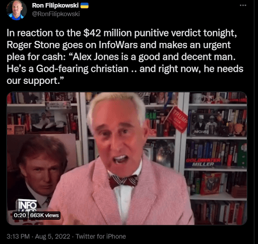 为了因应8月5号陪审团裁决琼斯赔偿4200万,川普的前竞选经理,被川普赦免的罪犯罗杰·斯通已经在InfoWars上号召给琼斯捐款了。