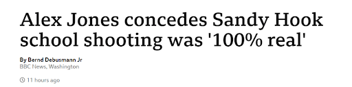 8月5日,位于德克萨斯州奥斯汀的一个陪审团决定,阴谋论大师亚历克斯·琼斯(Alex Jones)必须向2012年发生于康奈迪格州的桑迪·胡克校园枪击案(Sandy Hook shooting)的遇害者之一,一名6岁男孩的父母支付4520万美元的惩罚性赔偿金。而之前一天,法庭判决琼斯需要支付410万美元的补偿性赔偿。12名陪审员在确定了补偿性赔偿金之后的一天决定了惩罚性赔偿。