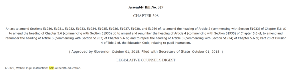 2015年通过,2016年1月开始实施的加州健康幼年法案(California Healthy Youth Act),最初称作加州立法AB 329。该法案要求七至十二年级的在校学生在初中和高中至少接受一次全面的性健康教育和艾滋病毒(HIV)预防教育。学区在当地选出的董事会和教育长(Superintendent)的领导下,负责选择他们将使用哪些课程和教学资源,来向学生教授这些内容。