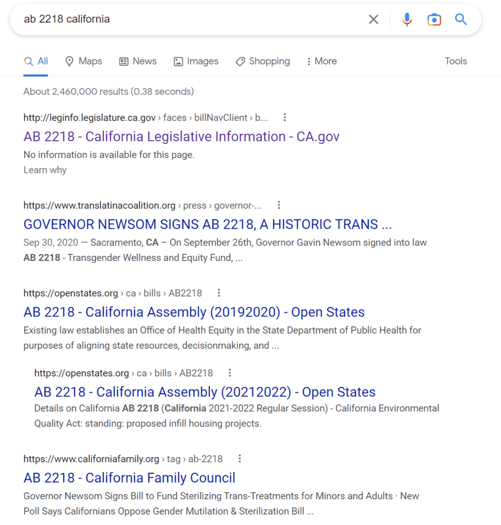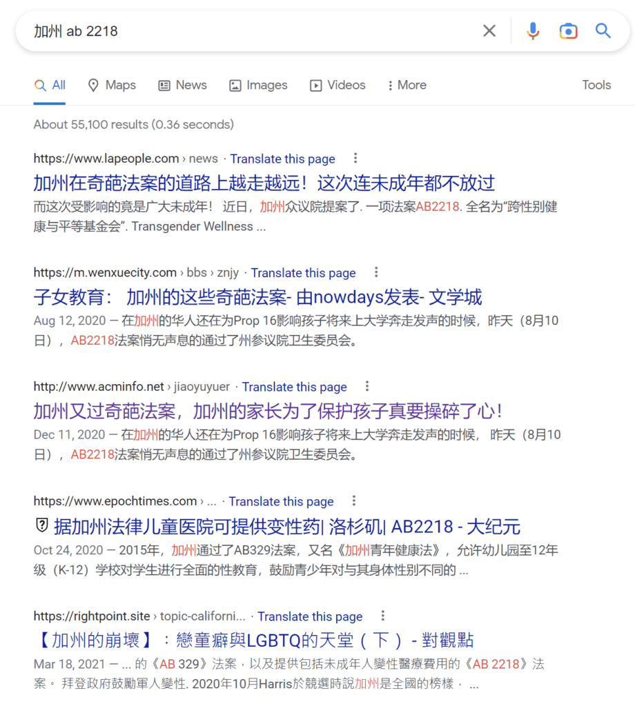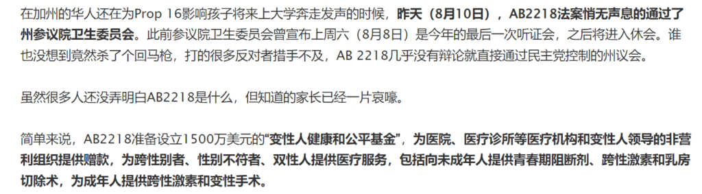 AB 2218是2020年8月通过的法案,目的是为跨性别人士的健康和平等设立一个专项基金。英文媒体比较平静,中文公众号又沸腾了,大喊国将不国,加州将不加州。