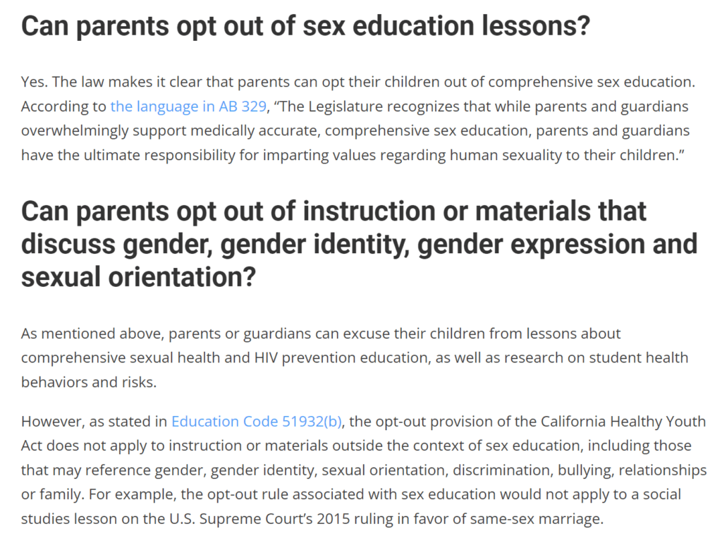 该法律也明确规定,父母可以选择不让他们的孩子参加全面性教育。根据AB 329中的语言,“立法机构认识到,虽然父母和监护人绝大多数支持医学上准确的全面性教育,但父母和监护人对向其子女传授有关人类性行为的价值观负有最终责任”。
