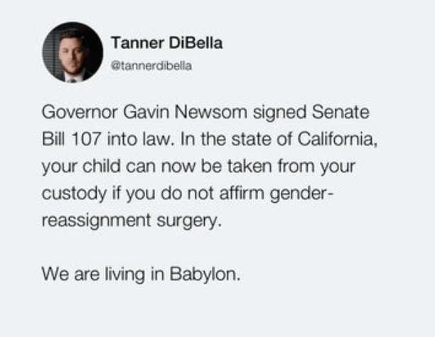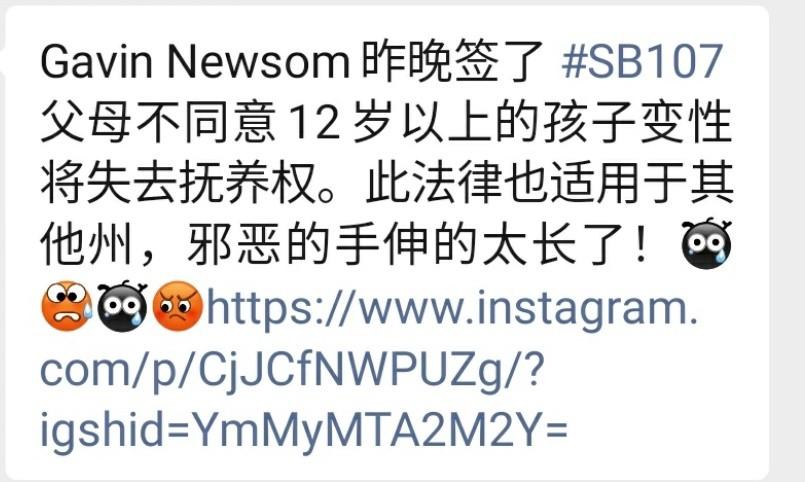 9月29日在脸书上的一篇帖子说:“加文·纽森签署参议院第107号法案,使之成为法律。在加州,如果你不给孩子做性别重置手术(即变性手术),就会失去对孩子的监护权。”。
