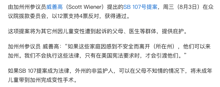 所以实际的法律,跟右翼媒体故意扭曲的解读完全相反。实际情况是,如果别的州因为父母允许其孩子变性,要取消其父母的监护权,加州拒绝执行这种请求,给其父母提供庇护。所以不是“不允许小孩变性就取消监护权”,而是“反对如果允许变性就取消父母监视权”的做法。到底哪个是保障人权,哪个是侵犯人权,高下立现。