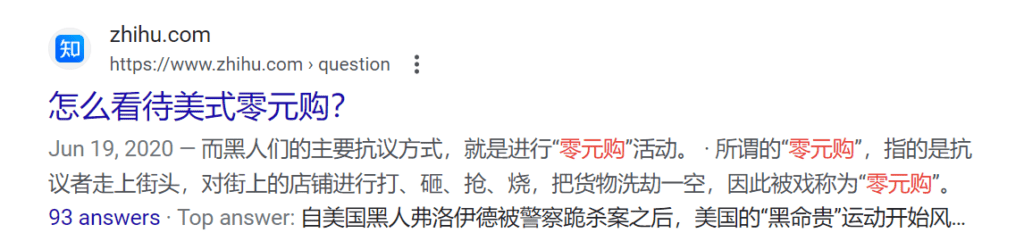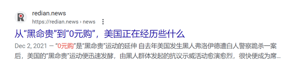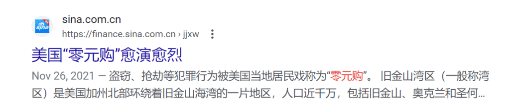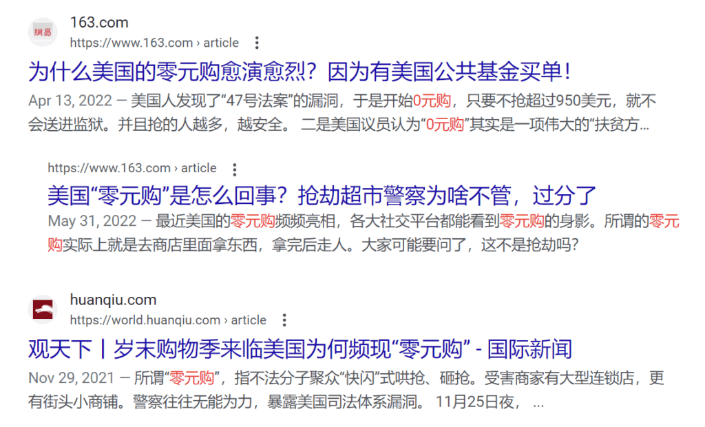 通过搜索引擎搜了一下,2020年以前,把零元购这个词跟黑人联系起来的新闻凤毛麟角,基本没有,基本上还是商家促销词汇。唯一看到的一条跟抢劫有关的新闻,也没有提到抢劫者的族裔。