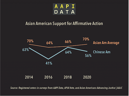 虽然告哈佛打头阵的是华人,并不代表华人或亚裔都支持这样的官司。如上图,2014到2020年的民调显示,大部分亚裔是支持大学AA政策的。即便对AA的支持率偏低的华裔,基本上还是支持的人更多些。我们不妨想一想,为什么会有那么多人支持AA?