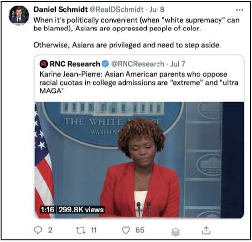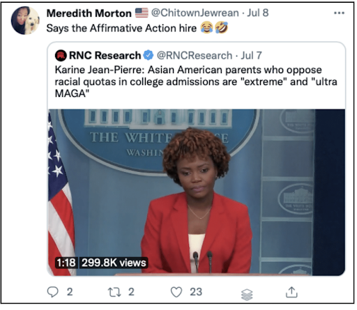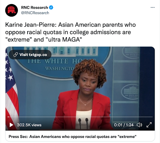 其他还有一些推文,比如说白宫发言人回答记者问时说“谁反对肤色招生录取,谁就是‘极端’、‘超级MAGA’”。这不是犯了RNC Research推文同样的错误吗?