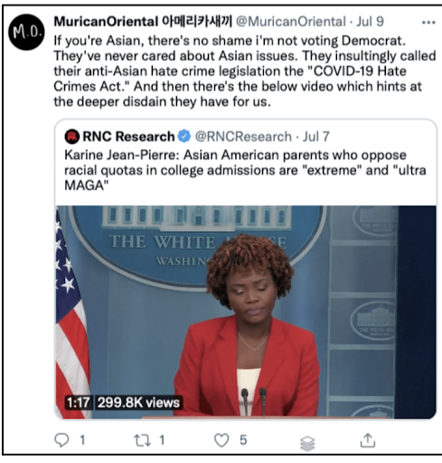 不久前,一个叫RNC Research(共和党全国委员会研究)的推特账号发了个推文,说白宫发言人卡琳·珍·皮埃尔(Karine Jean-Pierre)在答记者问时说反对大学招生中种族配额的亚裔美国父母是"极端"和"超MAGA"的(见上图)。注意,该推文是在珍·皮埃尔名字后面用个冒号,等于这些话就是直接出于珍·皮埃尔之口。