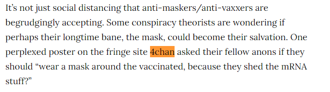 参见纽约时间《反口罩反疫苗者想戴口罩了,原因是怕被打疫苗的人传染》一文,据Vice报道,在一些右翼线上社区例如4chan(上图中标记),有人专门散布关于疫苗的不实信息,比如说应该在打过疫苗的人旁边戴口罩,以免沾染mRNA那样的不好的东西。