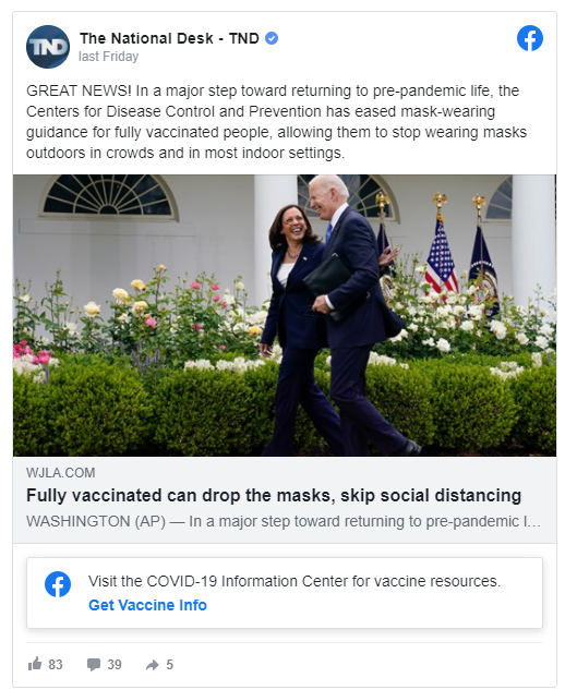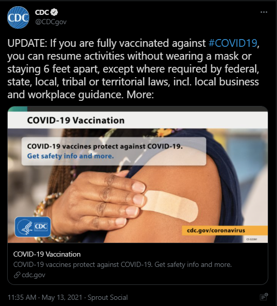 美国疾控中心(CDC)在5月13日更新了关于疫情的健康指引。该指引表示,如果完成了疫苗接种,在室内和室外均不需要戴口罩或保持社交距离。但是还是要遵循当地的政策。