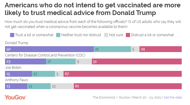 最近,YouGov的一项调查发现,82%的民主党人说他们信任CDC的医疗建议,几乎与说他们信任总统拜登的人数相同。只有三分之一的共和党人说他们信任CDC,而三分之二的人说他们信任前总统川普。