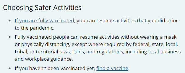 疾控中心的指导仍然建议在公共交通工具上使用口罩,包括飞机、火车和公交车,以及在医院、长期护理机构,监狱和无家可归者收容所。地方司法机构和企业也可以继续要求使用口罩,而且许多企业也还在这样做。大型零售商如沃尔玛、塔吉特、好市多等已经表示,接种疫苗的购物者和员工不必再在商店里戴口罩 — 除非根据当地法律有此要求。