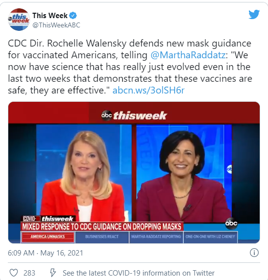 疾控中心主任罗谢尔·瓦伦斯基(Rochelle Walensky)出现在周日的四个新闻节目中,为CDC这项政策辩护。面对一连串关于已接种疫苗和未接种疫苗的人在一起的潜在不安全情况的问题。其中包括父母应该如何保护他们未接种疫苗的孩子,一线工作人员如何知道顾客是否接种了疫苗,以及公共安全是否真的应该由荣誉制度(honor system)来决定。
