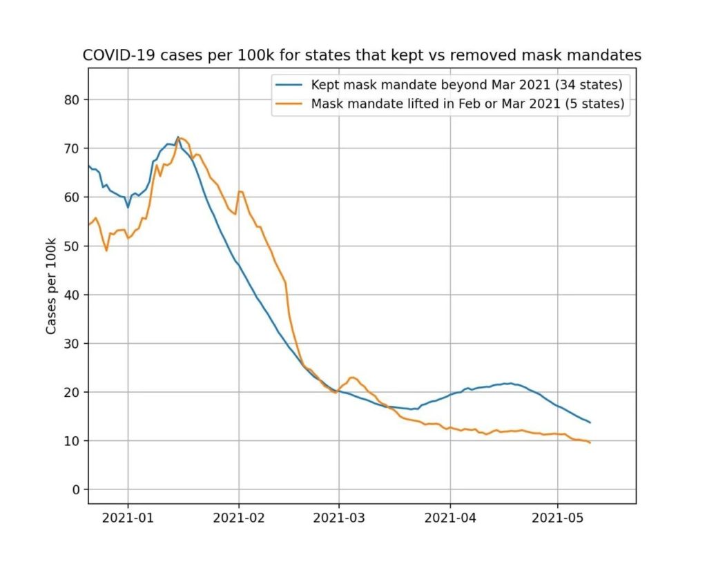 有数据分析对比了二月或三月就已经结束了州级别口罩令的州,与仍然维持口罩令的州,在感染人数,死亡人数方面的差异,可以看到都在下降,但是差异并不大。这未必能说明口罩与疫情有直接关联,因为很多城市各个商户都有自己的口罩要求。有的民众即使不要求也会戴,而有的即使有口罩令要求也不带。